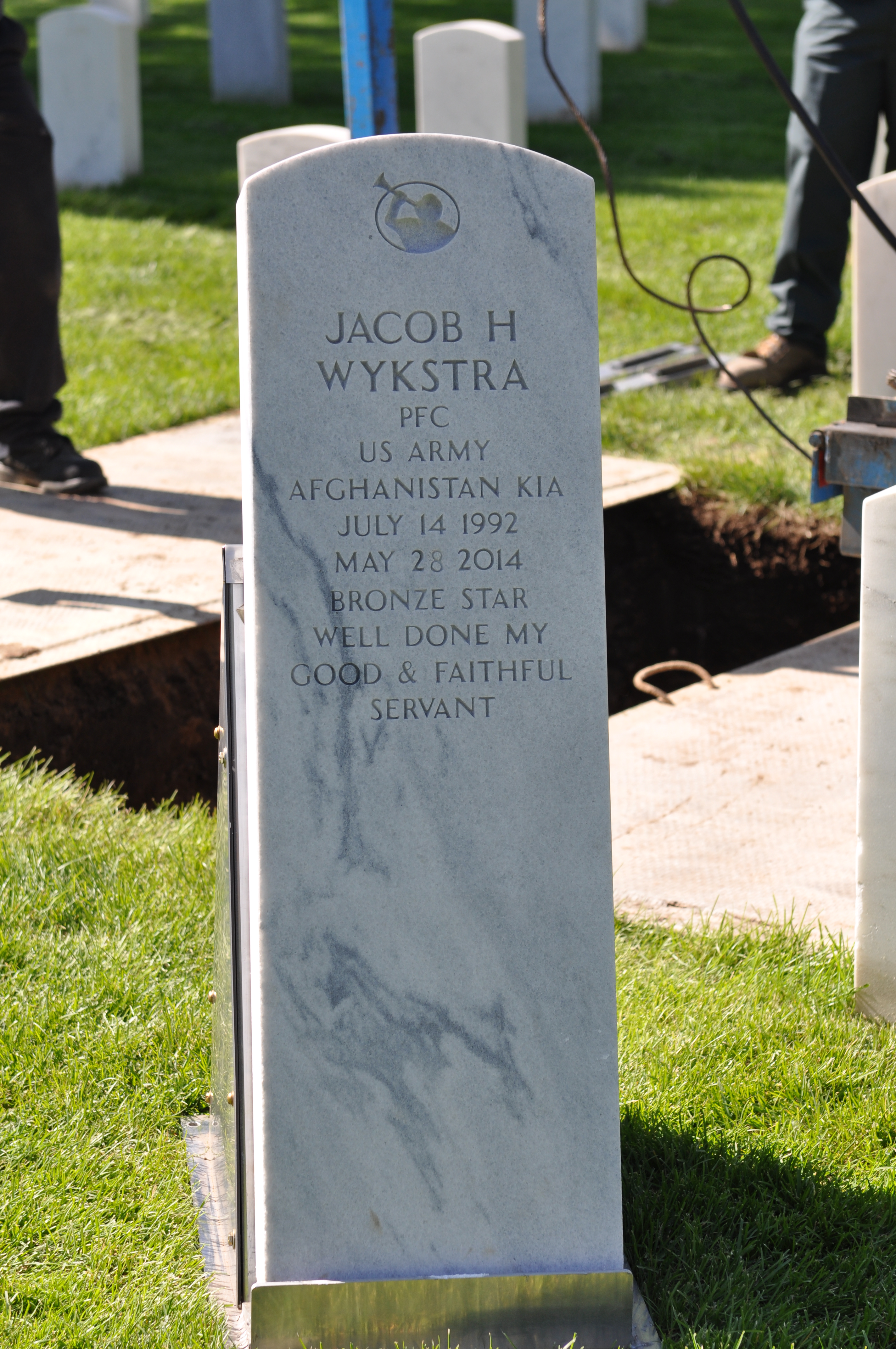 My son Jacob Henry Wykstra was killed in action 10 months ago in Maruf Afghanistan. He was selected from the infantry to be in a small medevac unit, trained to recover casualties and wounded soldiers from all NATO countries within the combat zones of Afghanistan. On May 28, 2014, Jake’s team was dispatched to recover Afghani casualties. Upon approach, the helicopter hit a dark communications tower and went down. There were 14 wounded and my son was the only casualty, as the Blackhawk landed on him crushing his body.